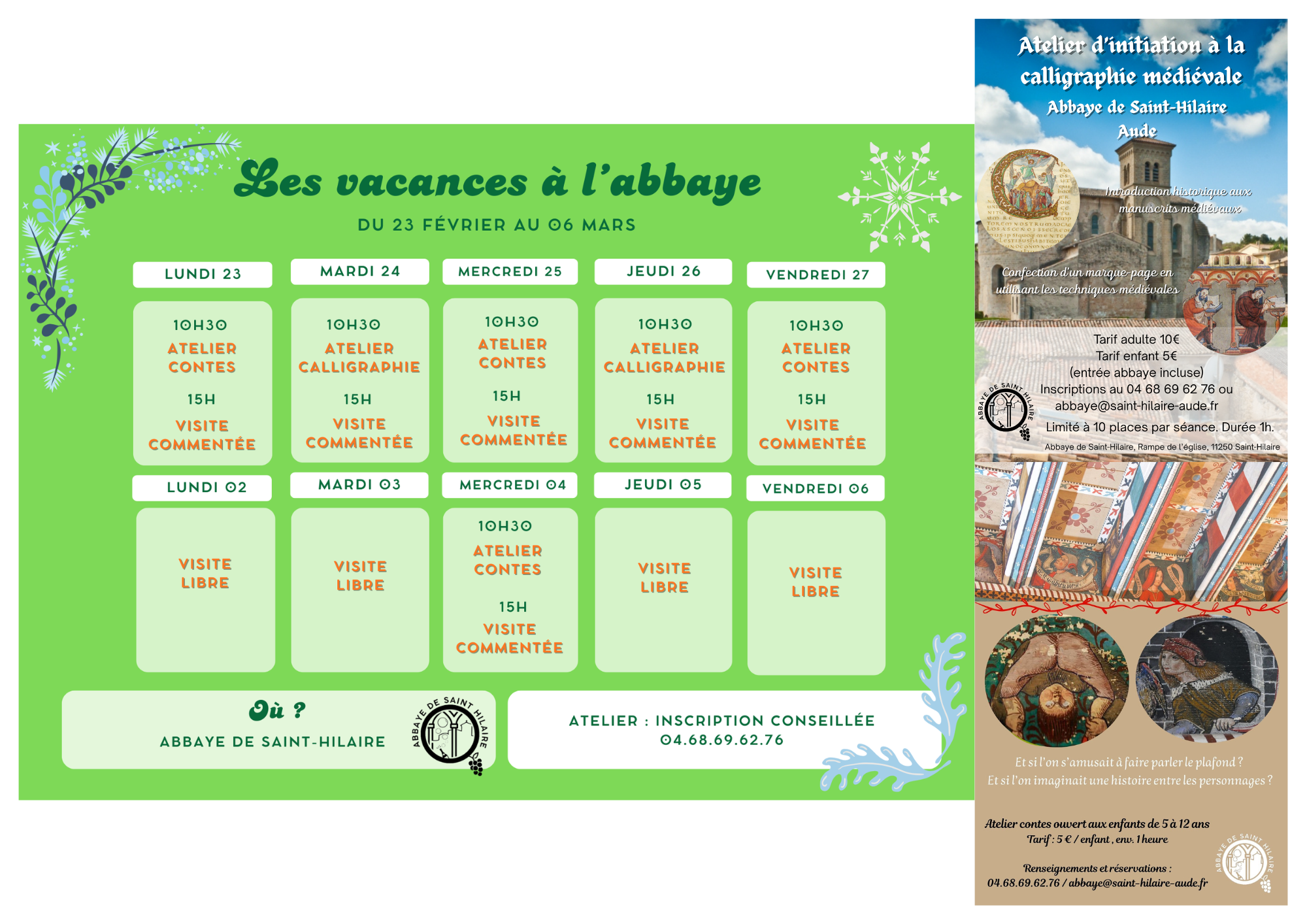 - Du 23 Février au 04 Mars 2026 Médiation culturelle Ateliers Contes & Calligraphie Vacances d'Hiver ⋅ Télécharger la pièce jointe Abbaye